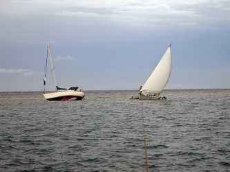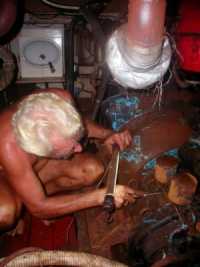 Versuchen das Leck zu dichten, kam uns ein befreundeter Segler zu Hilfe,