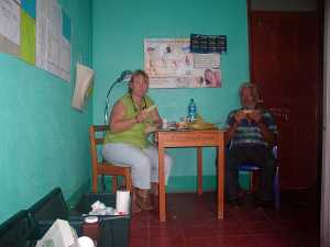 Was haben wir dort also gemacht? Zuerst sind wir die 5 ärmsten Provinzen des Landes abgefahren, haben mit vielen Leuten geredet. Mit den Pfarrern, den Leuten von Hilfsorganisationen, mit Ärzten in den Gesundheitszentren, mit den Direktoren der örtlichen Vertretungen des Gesundheitsministeriums etc. Dann haben wir 5 Orte in den beiden nördlichsten Provinzen ausgesucht, die uns am bedürftigsten erschienen. Orte, in denen bis zu 1000 Personen lebten und in denen es keinerlei Gesundheitsfürsorge gab. Wir haben ein Auto gekauft, einen Vierrad getriebenen Pickup mit Differenzialsperre; haben ein Bankkonto eröffnet, eine Unterkunft in einer kirchlichen Herberge gefunden, in der wir auch unsere Apotheke unterbringen konnten und dann sind wir an fünf Tagen der Woche zu den fünf ausgewählten Orten gefahren, in denen Katrin bis zu 120 Patienten pro Tag behandelt hat.