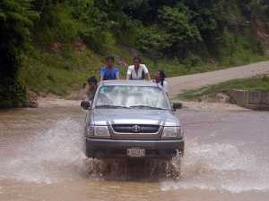 Weiter ging es über Stock und Stein in langsamen Schritttempo Richtung Limay. Kurz vor diesem Ort trafen wir auf eine Schotterstrasse, die uns nach Limay brachte und weiter in Richtung Estelí führte, wohin wir wollten. Eine Stunde hinter Limay endete der Weg an einem Fluss. Wir hatten uns verfahren. 30 Minuten zurück und wir fanden den richtigen Weg, bis dieser wiederum vor einem Fluss endete. Der durch die anhaltenden Regenfälle angeschwollenen Fluss - wiederum ca. 100 m breit - aber rasch fließendes braunes Wasser transportierend schien das Aus zu signalisieren, da tauchte aus dem Nichts ein kleiner Junge auf. Er bot sich an uns zu führen, ließ die Hose fallen und watete langsam in einem Bogen durch die braune Flut. Als er zurück war stellten wir ihn ans Auto. An seiner Unterhose konnten wir die Wassertiefe messen. Sie reichte bis zur Mitte unserer Scheinwerfer. Um das Auto leichter zu machen, liessen auch wir - Katrin, Javiér und ich - die Hosen runter und wateten ans andere Ufer. Peter folgte, würgte in der Mitte des Flusses den Motor ab, der aber sofort wieder ansprang, und nach wenigen Minuten war auch er auf der anderen Seite. Wir atmeten erleichtert auf, stiegen wieder in unsere durchweichten, schlammigen Sachen und weiter gings. An einer Weggabelung entschieden wir uns für links. Als wir ein kleines Dorf erreichten, fragten wir nach dem Weg. Wir hatten den Weg nach Pueblo Nuevo gewählt, wollten aber nach Estelí. Wieder 30 Minuten zurück und an der Gabelung den anderen Ast unter die Räder genommen. Doch hatten wir kein Glück, nach 20 Min. versperrte ein im Schlamm abgerutschter Tieflader, der quer über dem Weg stand und dessen Vorderräder im Graben hingen, den Weg. Also wieder zurück und den 70 km Umweg über Pueblo Nuevo nach Estelí gefahren, wo wir um 23.30 eintrafen. Beim dritten Hotel hatten wir Glück; es waren noch Zimmer frei. Schnell zogen wir trockene Sachen an und fanden als einzige Möglichkeit zur Nahrungsaufnahme eine Tankstelle. Alte Pizza aus der Mikrowelle war das einzig Brauchbare. Das Bier durften wir zwar kaufen, aber erst spaeter auf der Strasse trinken, da nach 24 Uhr der Alkoholgenuss in der Tankstelle untersagt war. Um 1.00 Uhr fielen wir totmuede ins Bett- nicht ohne den Wecker auf 5:50 Uhr gestellt zu haben - denn um 8:00 hatten wir einen Termin im knapp zwei Stunden entfernten Ocotal.